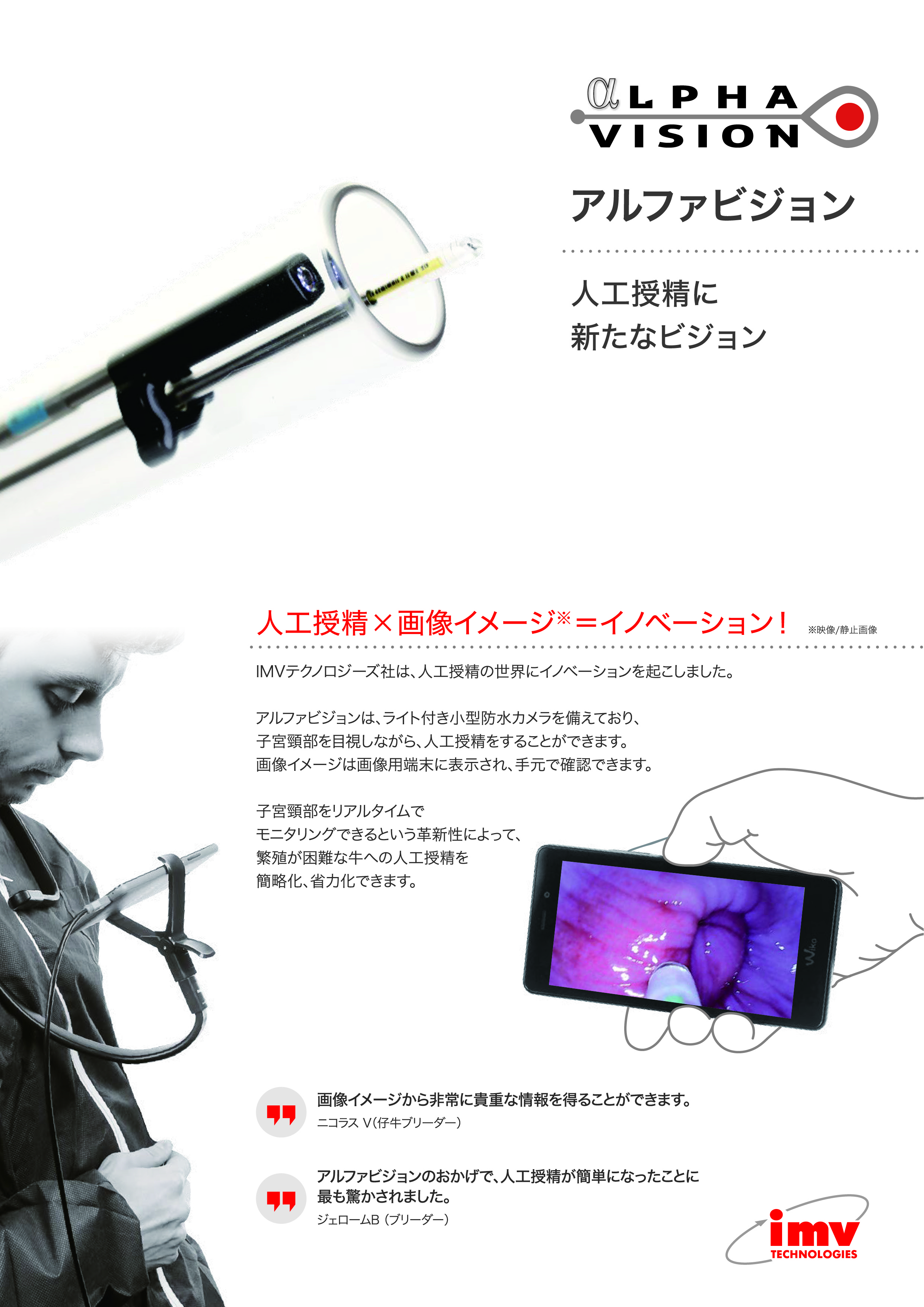 人工授精の際、牛の子宮頸部の位置や状態が分からず困ったことはございませんか?アルファビジョンなら、カメラにより子宮頸部の位置や状態を確認しながら人工授精ができます。また、画像を目視確認することで、より正確に注入器をコントロールできます。従来の人工授精と比較し、正確性の向上、省力化、簡略化が期待できます。