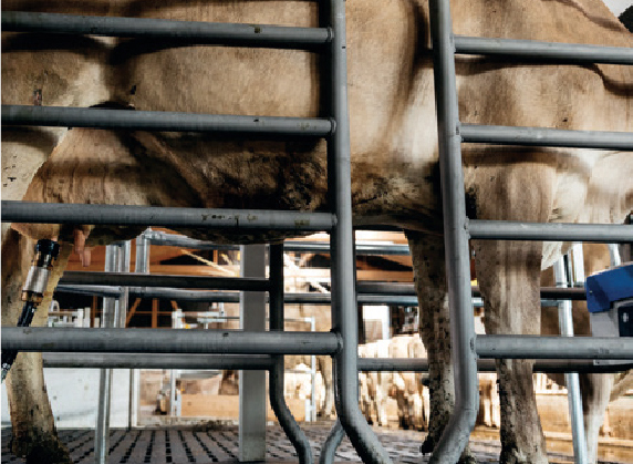 ミルクラインには、各乳房に直径19mmのミルクホースを採用。真空圧変動を抑えることで乳房の負担の少ない安定した搾乳プロセスを提供します。また、乳房ごとに乳量・真空圧・血乳・伝導率を検知するセンサーを配置。データをリアルタイムで酪農家のスマホ端末に送信され状況を確認することができます。